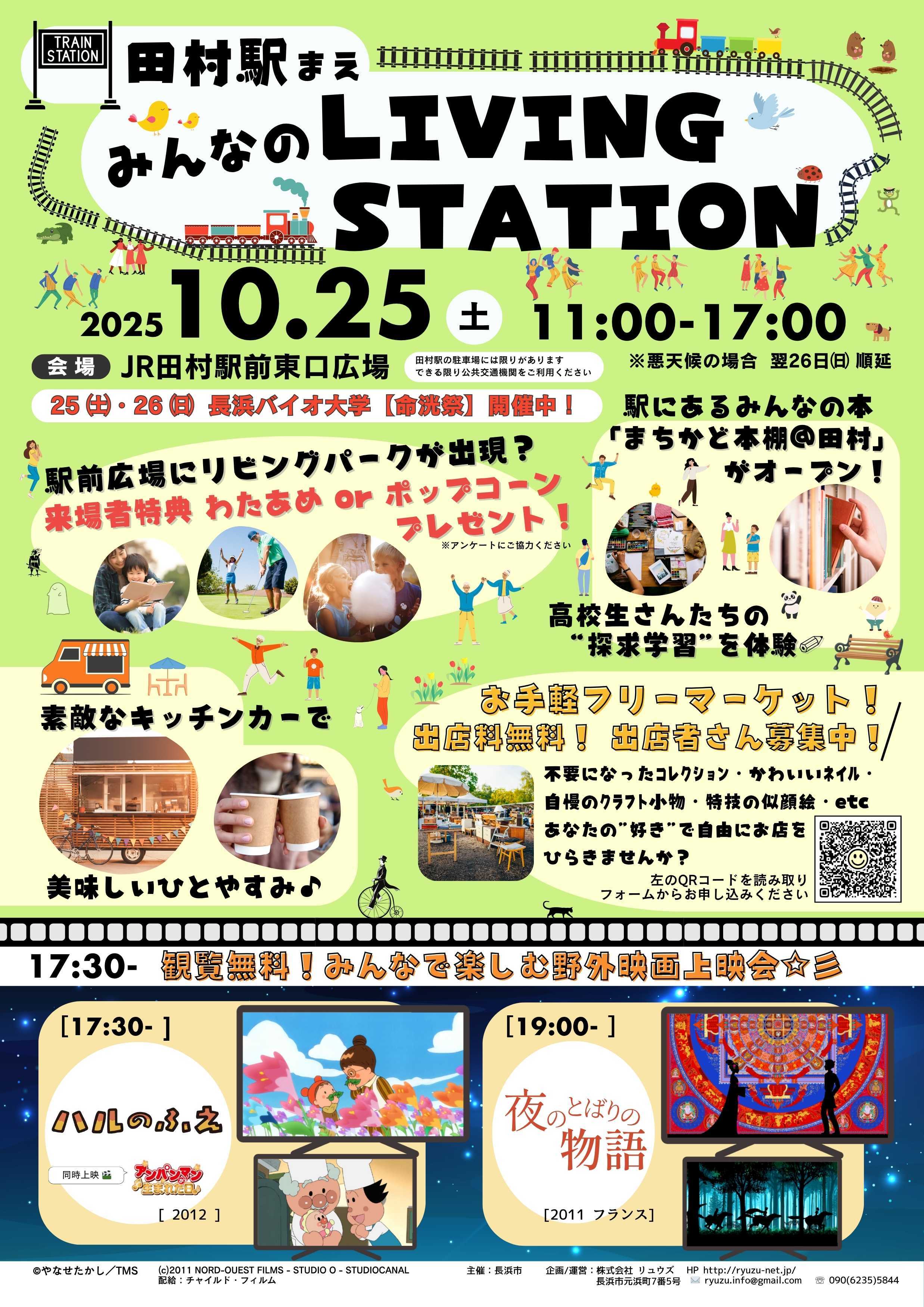 - 2025/10/16お知らせ2025.10.25(土)北陸本線JR田村駅東口にて「田村駅まえ みんなのLIVING STATION」を開催します(入場無料)フリマや野外映画もあります
